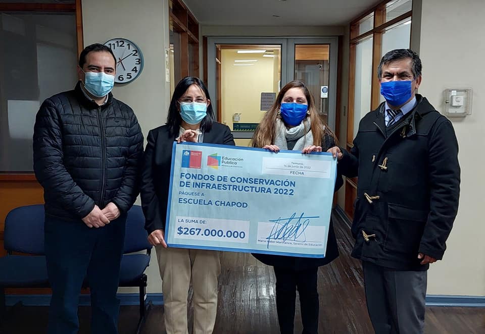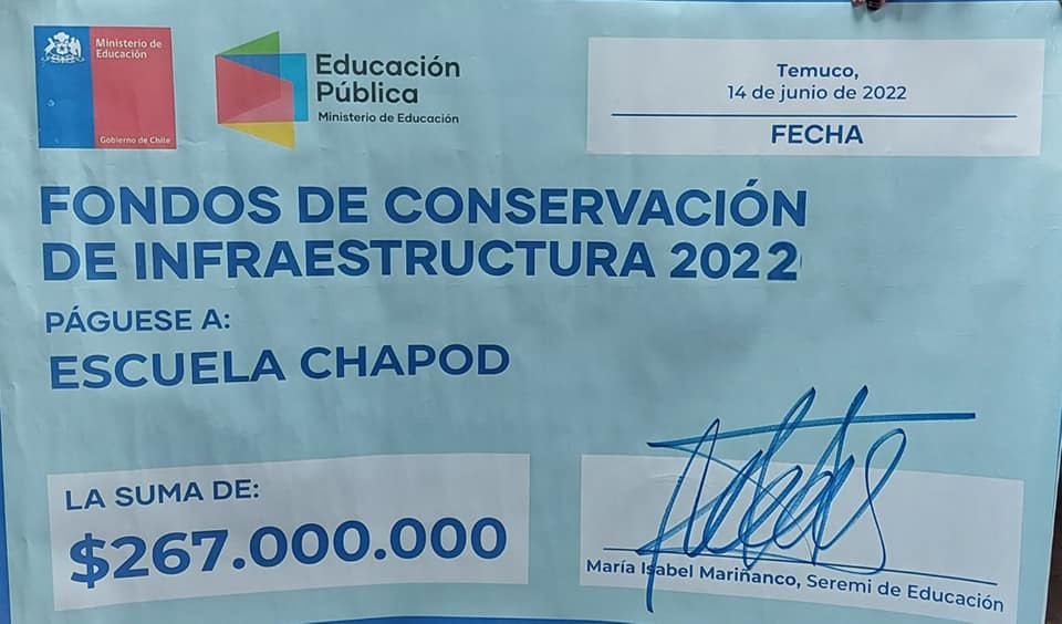 En la ocasión, la máxima autoridad regional aprovechó de hacer entrega del cheque simbólico, al director de la Escuela Chapod, Sr.Pedro Cuminao, proveniente del Fondo de Conservación por un monto de $ 267.000.000 para mejoras en infraestructura del establecimiento al que representa, el cual llevó y compartió junto a esta importante noticia con sus equipos de trabajo y estudiantes, quienes se verán beneficiados con este gran logro.